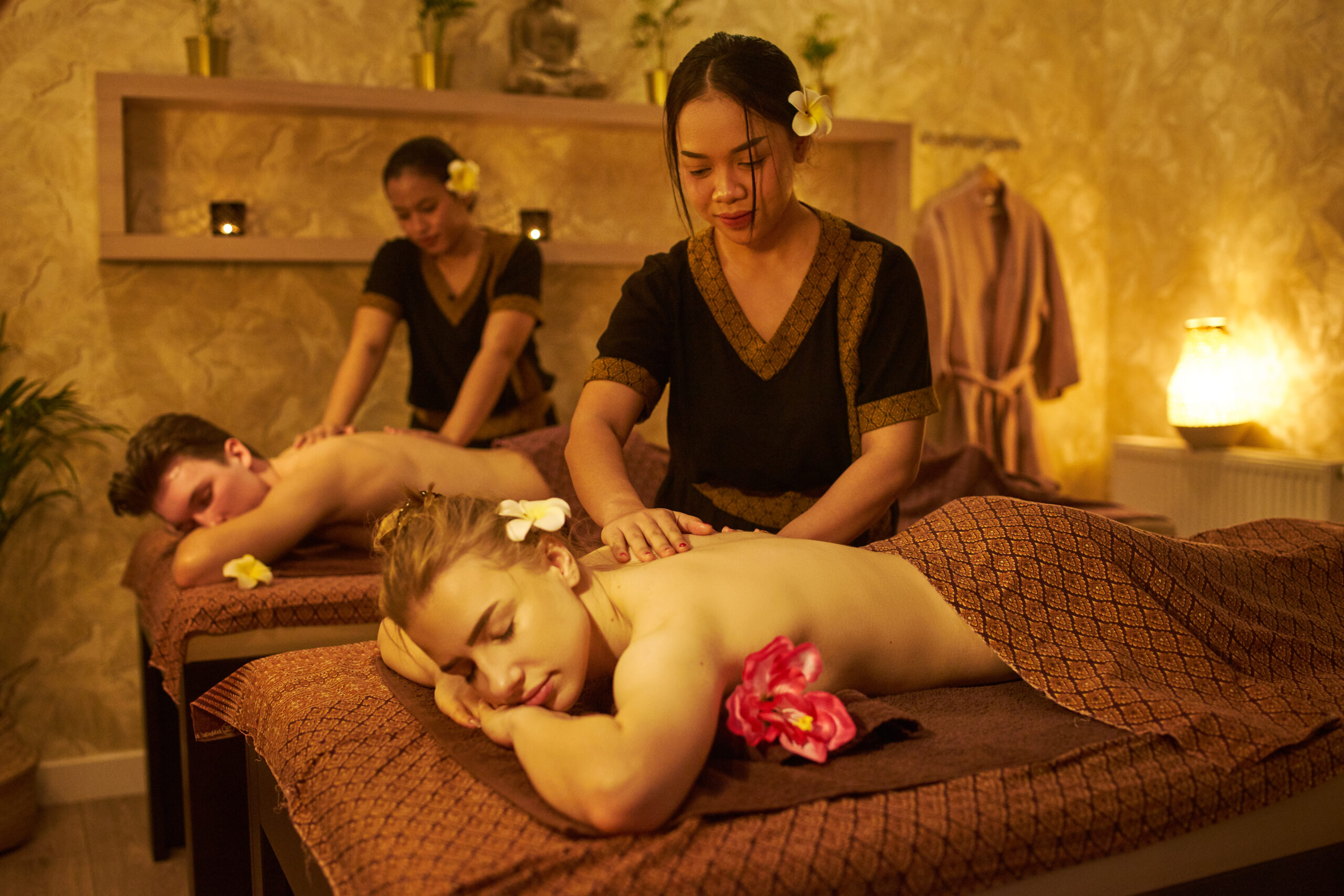 Masaż dla dwojga, to wyjątkowa forma relaksu, podczas której możesz spędzić czas z ukochaną osobą, mamą, siostrą czy koleżanką. Specjalnie przygotowane, komfortowe gabinety w Asana SPA, wyposażone są w dwa łóżka do masażu, aby cały zabieg móc spędzić razem. Masaż dla dwojga to nie tylko pomysł na świetne spędzenie czasu, ale przede wszystkim kompleksowa terapia dla ciała i duszy. W klasycznym masażu tajskim dla dwojga, doświadczycie Państwo zbawiennego wpływu tajskich technik rozciągania, ugniatania, refleksoterapii i akupresury. Masaż tajski ma nieoceniony wpływ w dolegliwościach ze strony kręgosłupa i spiętych mięśni. Dla sympatyków lżejszych masaży polecamy masaż balijski dla dwojga, który jest najczęstszym wyborem naszych klientów. Podczas masażu balijskiego rozmasowywane są wszystkie partie mięśni, przy wykorzystaniu ciepłego olejku kokosowego. Bez względu na to, który masaż wybierzesz, masz pewność pełnej satysfakcji i efektywności.